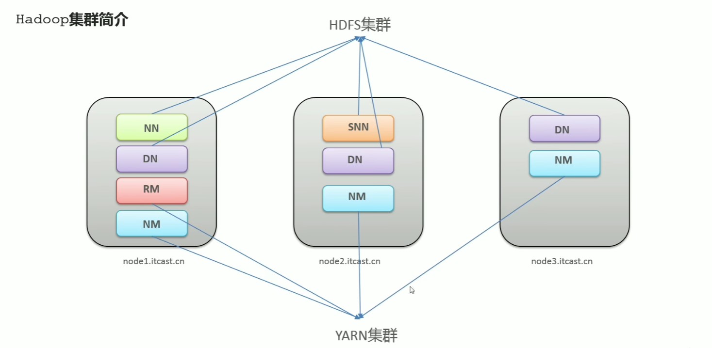 其中 node1 为命名节点(namennode)存放主机,用于指挥其他两台存放数据节点(DataNode)的主机